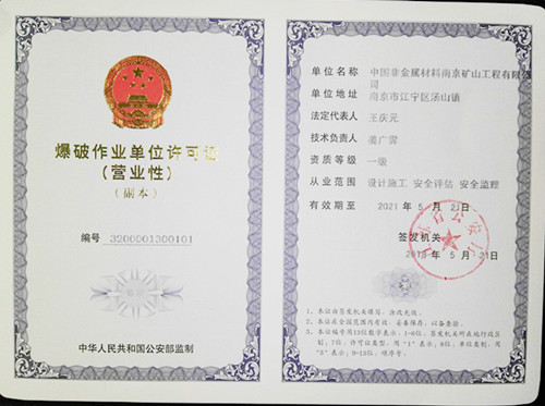 本網(wǎng)訊 2018年5月21日,經(jīng)江蘇省公安廳核準(zhǔn),公司獲得營(yíng)業(yè)性爆破作業(yè)單位壹級(jí)資質(zhì)。這是公司繼去年取得礦山工程施工總承包一級(jí)資質(zhì)后的又一重大突破,成為國(guó)內(nèi)礦山工程板塊同時(shí)擁有礦山工程施工總承包壹級(jí)資質(zhì)和營(yíng)業(yè)性爆破作業(yè)單位壹級(jí)資質(zhì)的雙一級(jí)企業(yè)。